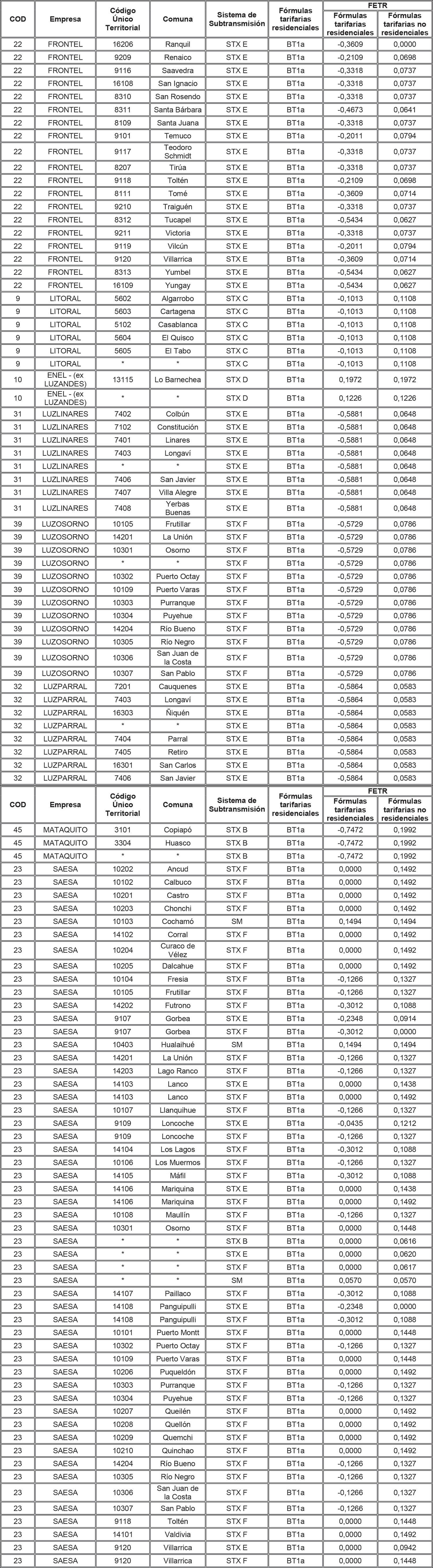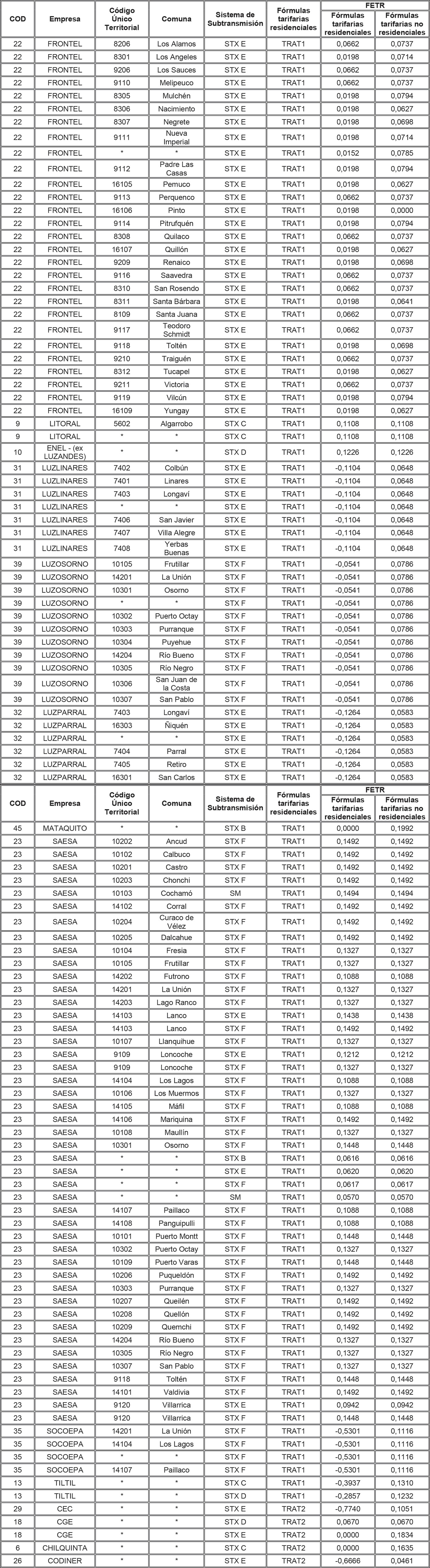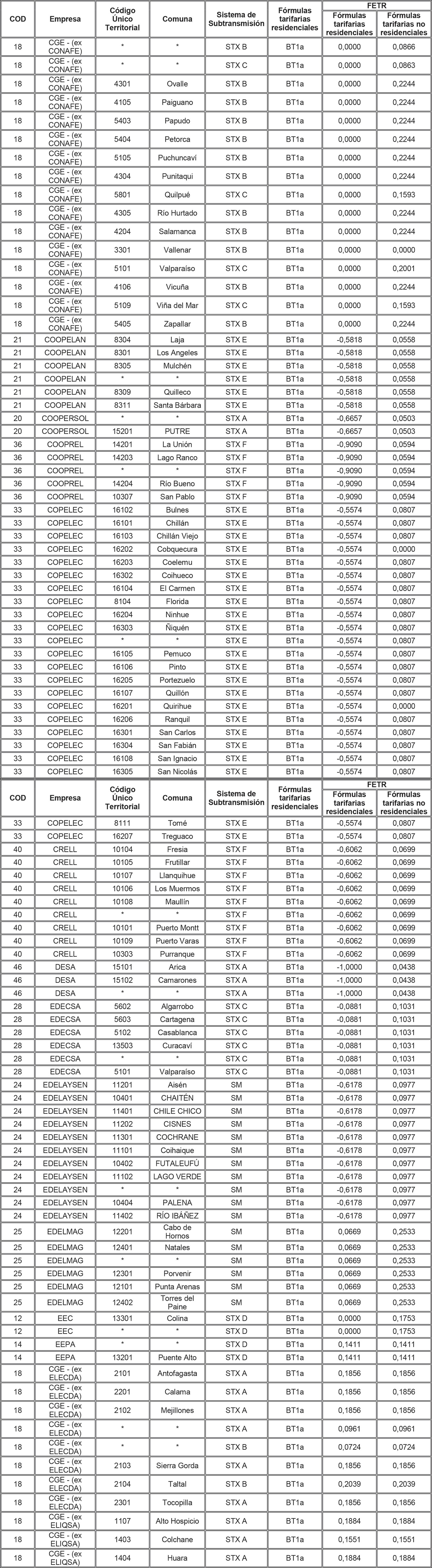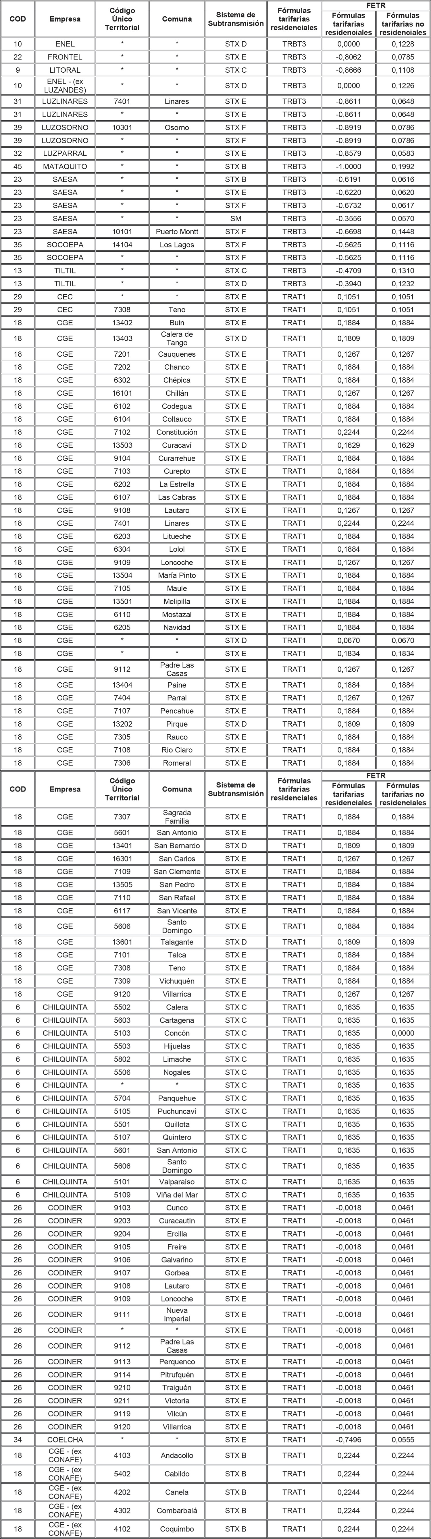 Para aquellas combinaciones empresa/comuna/sistema de transmisión zonal que no tienen asignado en la tabla anterior un FETR para alguna de las tarifas residenciales, se deberá aplicar el FETR determinado para la combinación empresa/sistema de transmisión zonal/tarifa, determinado para aquellas comunas no individualizadas (es decir, que presentan un * en la columna Comuna de la tabla anterior).