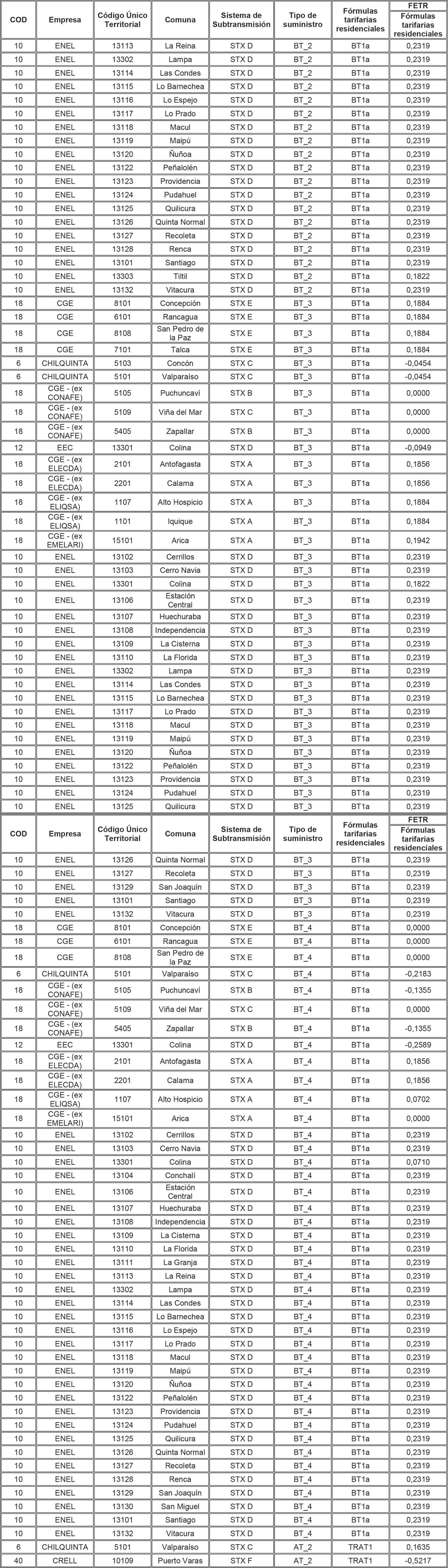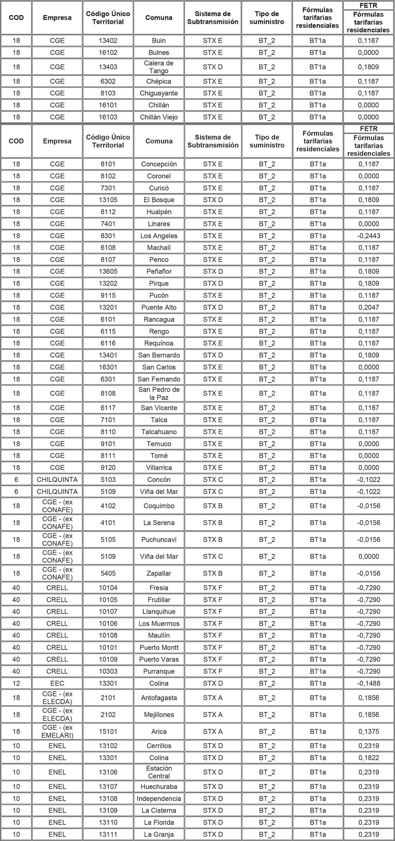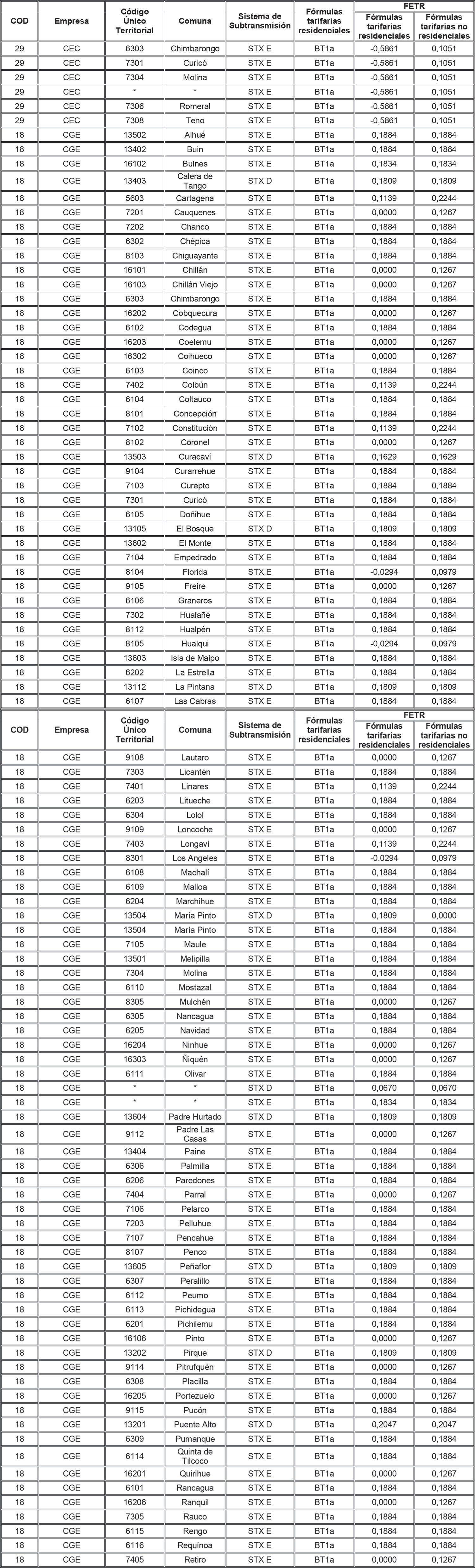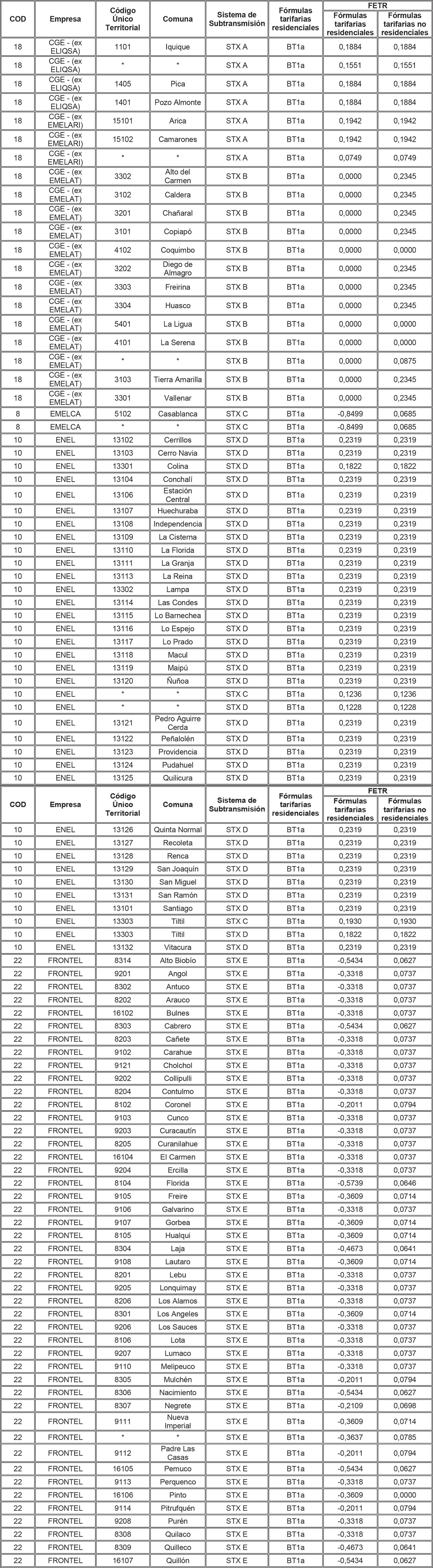 Para aquellas combinaciones empresa/comuna/sistema de transmisión zonal que no tienen asignado en la tabla anterior un FETR para alguna de las tarifas residenciales, se deberá aplicar el FETR determinado para la combinación empresa/sistema de transmisión zonal/tarifa, determinado para aquellas comunas no individualizadas (es decir, que presentan un * en la columna Comuna de la tabla anterior).