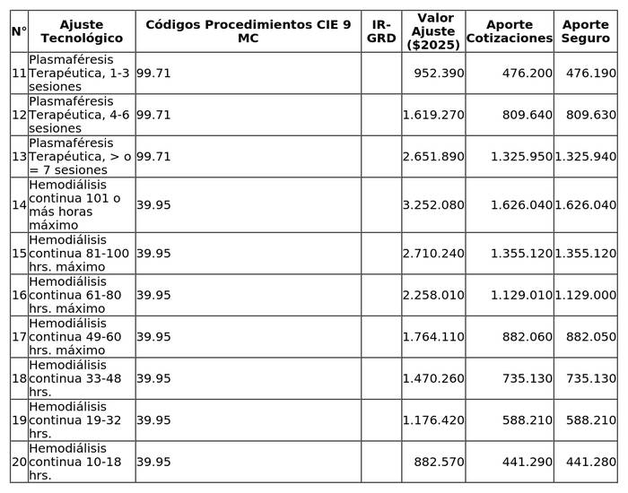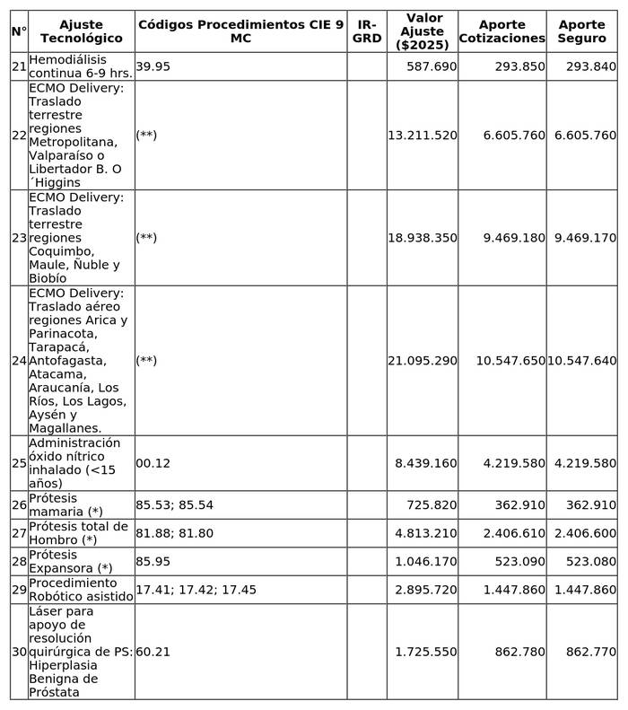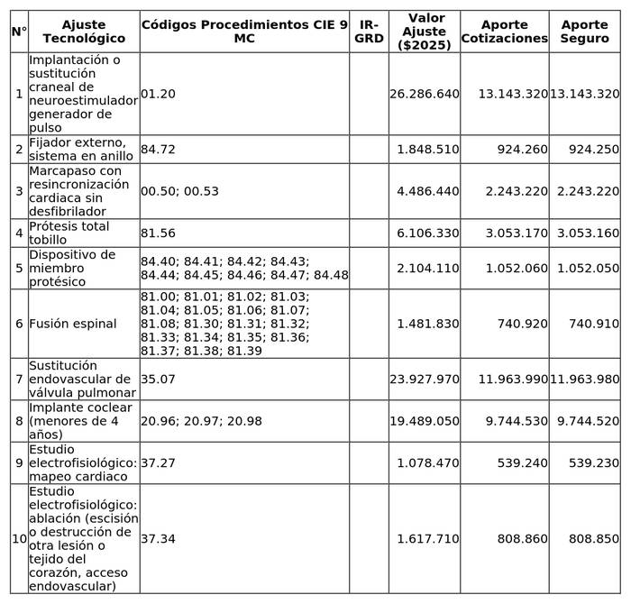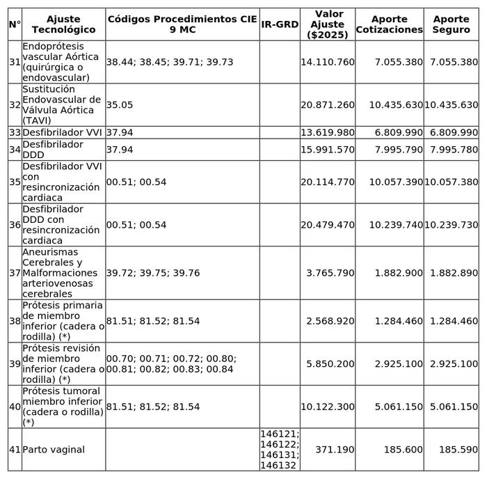 D.O. 20.12.2025 al pago ocasionado de manera adicional al pago otorgado por el mecanismo de pago GRD que considera prestaciones, dispositivos, fármacos, prótesis o insumos que son parte de una intervención sanitaria y se pagan adicional al pago otorgado por el mecanismo de pago GRD y respecto de los procedimientos CIE9-MC definidos (Anexo III). El pago de estos ajustes será financiado en un 50% con Aporte Cotización (FAM) y, el otro 50% con Aporte Seguro. Aquellos ajustes que incorporan asterisco (*) indican uso unitario, es decir, el valor se paga por cada ajuste utilizado; lo anterior, para los casos en que aplique bilateralidad en el mismo egreso hospitalario.