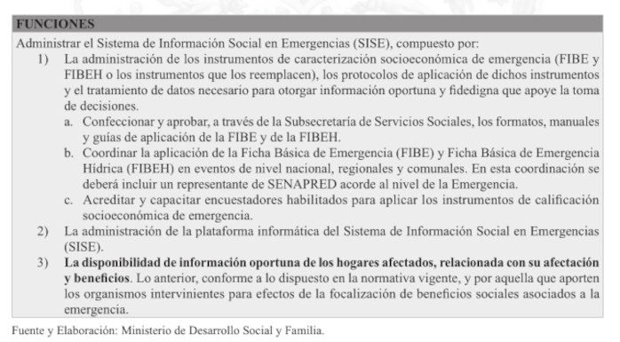 En este sentido, las funciones del Ministerio de Desarrollo Social y Familia, a través de la Subsecretaría de Servicios Sociales, respecto los instrumentos de caracterización socioeconómica de emergencia, son las que se indican: