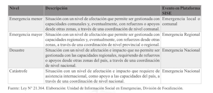 Los procesos asociados a la coordinación entre instituciones y el levantamiento de información a través de la FIBE, varían según los niveles de emergencia. La ley N° 21.364 define dichos niveles considerando un conjunto de factores y condiciones que apuntan tanto a la magnitud del evento como a los recursos involucrados en la respuesta y rehabilitación de los hogares afectados.
