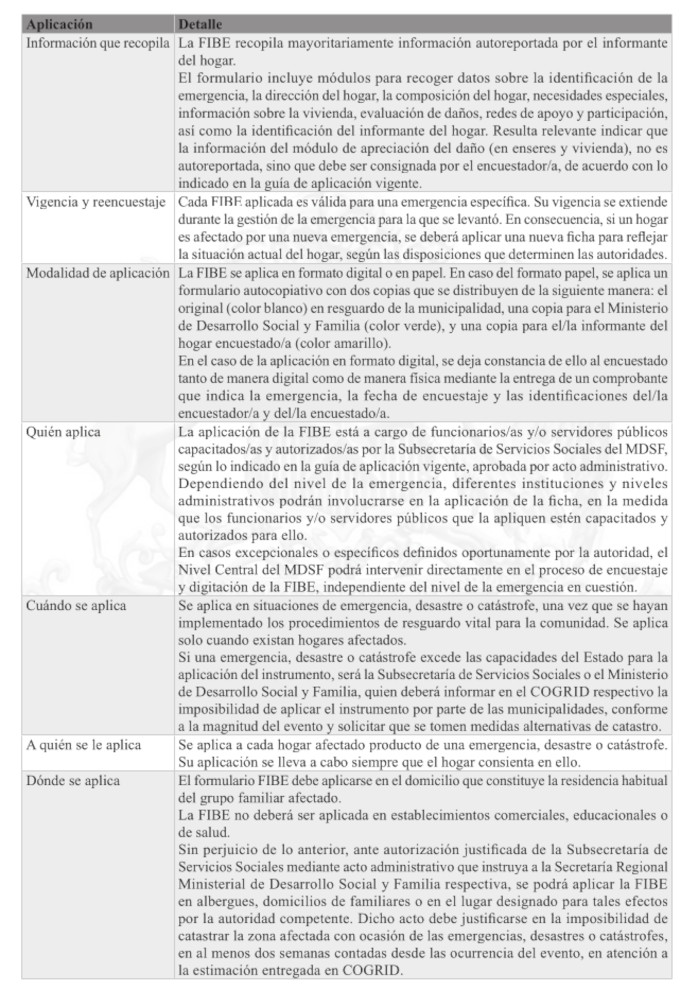Si bien su utilización no requiere que las situaciones de emergencia o desastre alcancen gran connotación o que existan declaraciones de catástrofe, en circunstancias determinadas por las autoridades nacionales, el catastro generado a partir de la aplicación de la FIBE, permitirá que las medidas de respuesta, rehabilitación y reconstrucción se definan, organicen y alcancen a la ciudadanía afectada, según se determine en el Comité Nacional para la Gestión del Riesgo de Desastre (COGRID) o en el Comité de Ayudas Tempranas(2).
