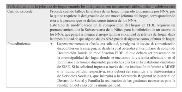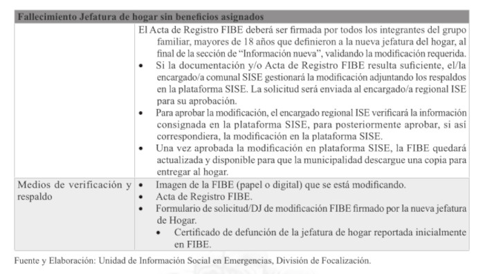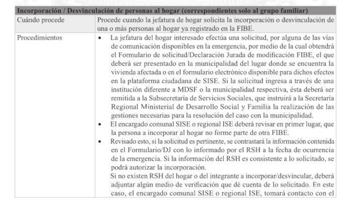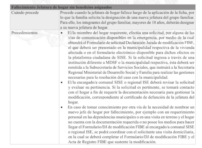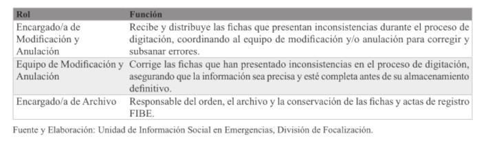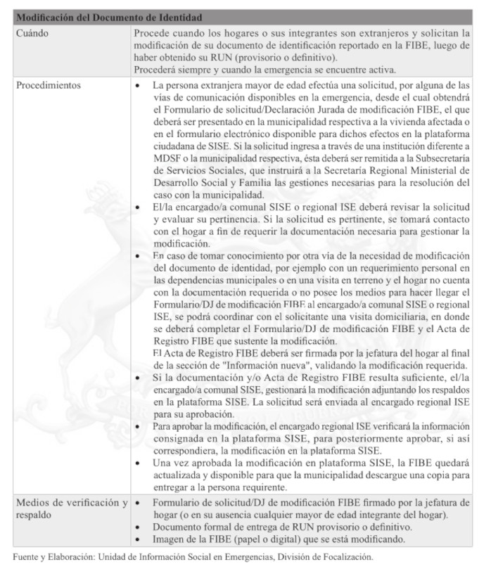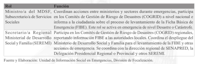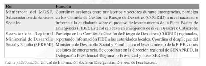 De acuerdo con lo establecido en dicha norma, corresponde al Ministerio de Desarrollo Social y Familia (MDSF o Midesof), a través de la Subsecretaría de Servicios Sociales (SSS), la confección de la Ficha Básica de Emergencia (FIBE) y de la Ficha Básica de Emergencia Hídrica (FIBEH), así como sus respectivos formatos, manuales y guías de aplicación, los cuales deben ser comunicados a todas las municipalidades, delegaciones presidenciales regionales y provinciales, al Servicio Nacional de Prevención y Respuesta ante Desastres (SENAPRED) o su sucesor legal, al Ministerio del Interior y Seguridad Pública, otros Ministerios y a los servicios públicos relacionados. A nivel comunal, será la municipalidad respectiva quien deberá desplegar las acciones necesarias para el levantamiento de la información a través de la FIBE o la FIBEH en coordinación con el Ministerio de Desarrollo Social y Familia.