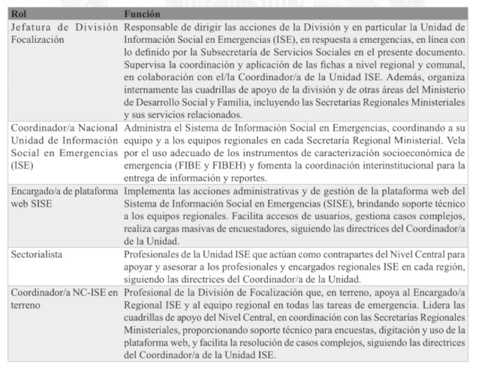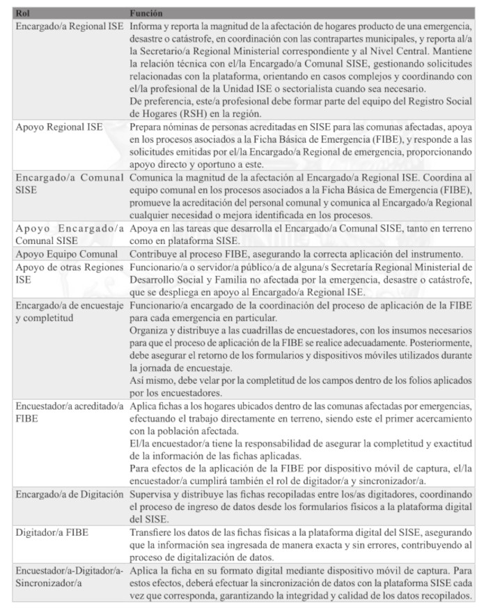 A continuación se presenta un listado de los roles que pueden asumir los/las distintos/as actores involucrados en la gestión de emergencias asociadas a la FIBE, especificando las funciones de cada uno/a de ellos/ellas según el nivel de emergencia, las necesidades del Ministerio de Desarrollo Social y Familia en la emergencia en particular, o bien, según la connotación de esta.