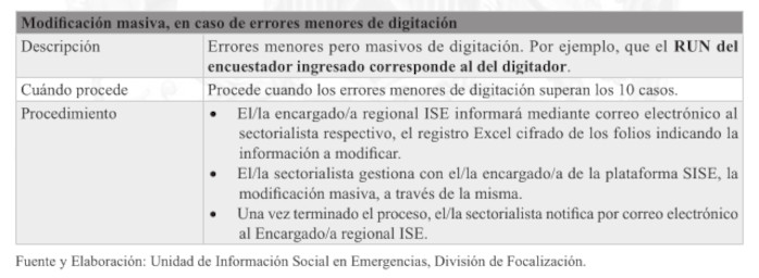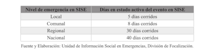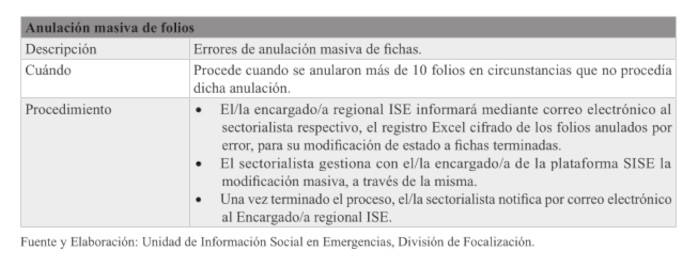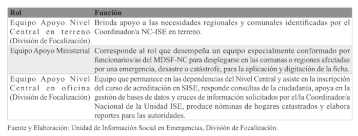 Unidad de Información Social en Emergencias (ISE): unidad dependiente de la Subsecretaría de Servicios Sociales a través de la División de Focalización, cuya finalidad es administrar el Sistema de Información Social en Emergencia (SISE) y coordinar los procesos de levantamiento y entrega de información asociados a éste, necesarios para la toma de decisiones y respuesta en la emergencia.