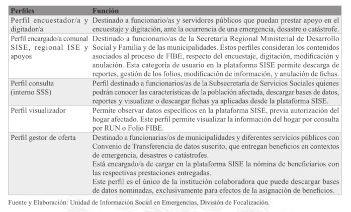 Asimismo, la información recogida a través de la FIBE y la FIBEH es parte del Sistema de Información Social en Emergencias (SISE) del Ministerio de Desarrollo Social y Familia, para apoyar así a los órganos del Estado competentes en la toma de decisiones frente a situaciones de emergencia, en cada una de las fases del ciclo de gestión del riesgo de desastres.