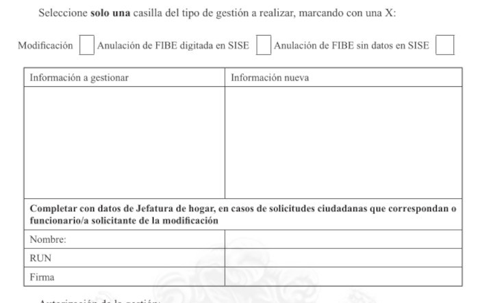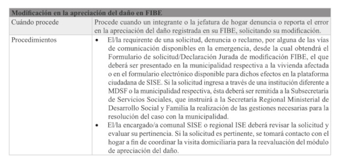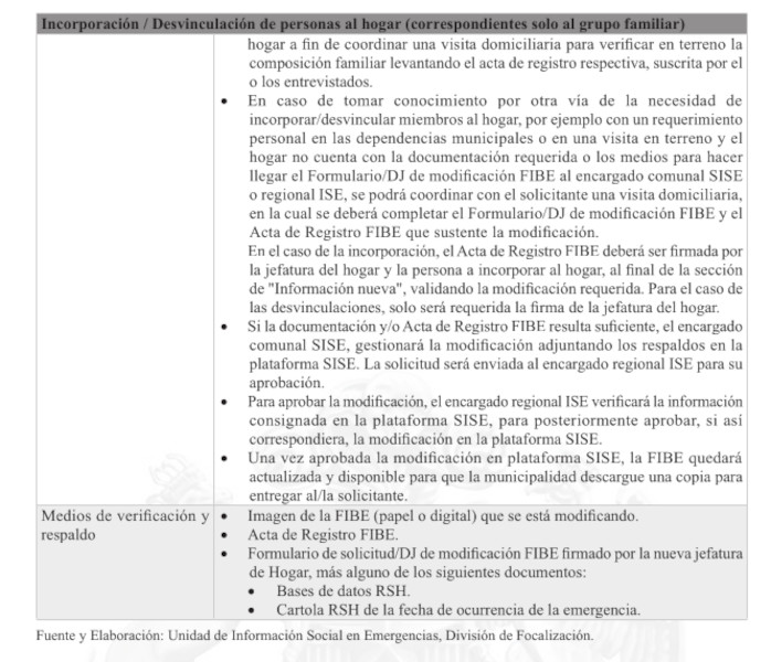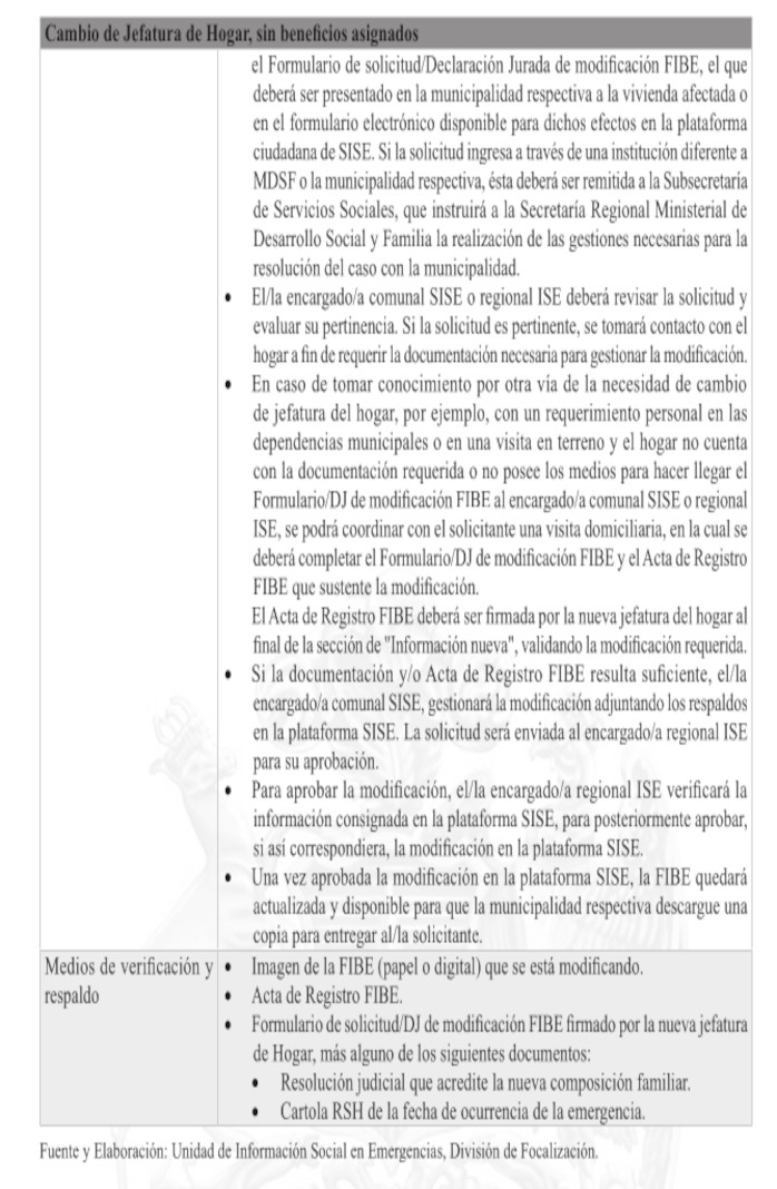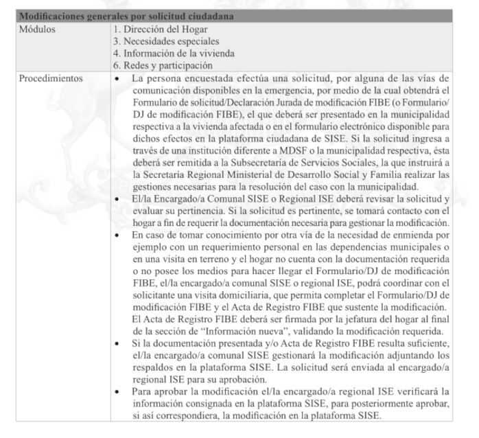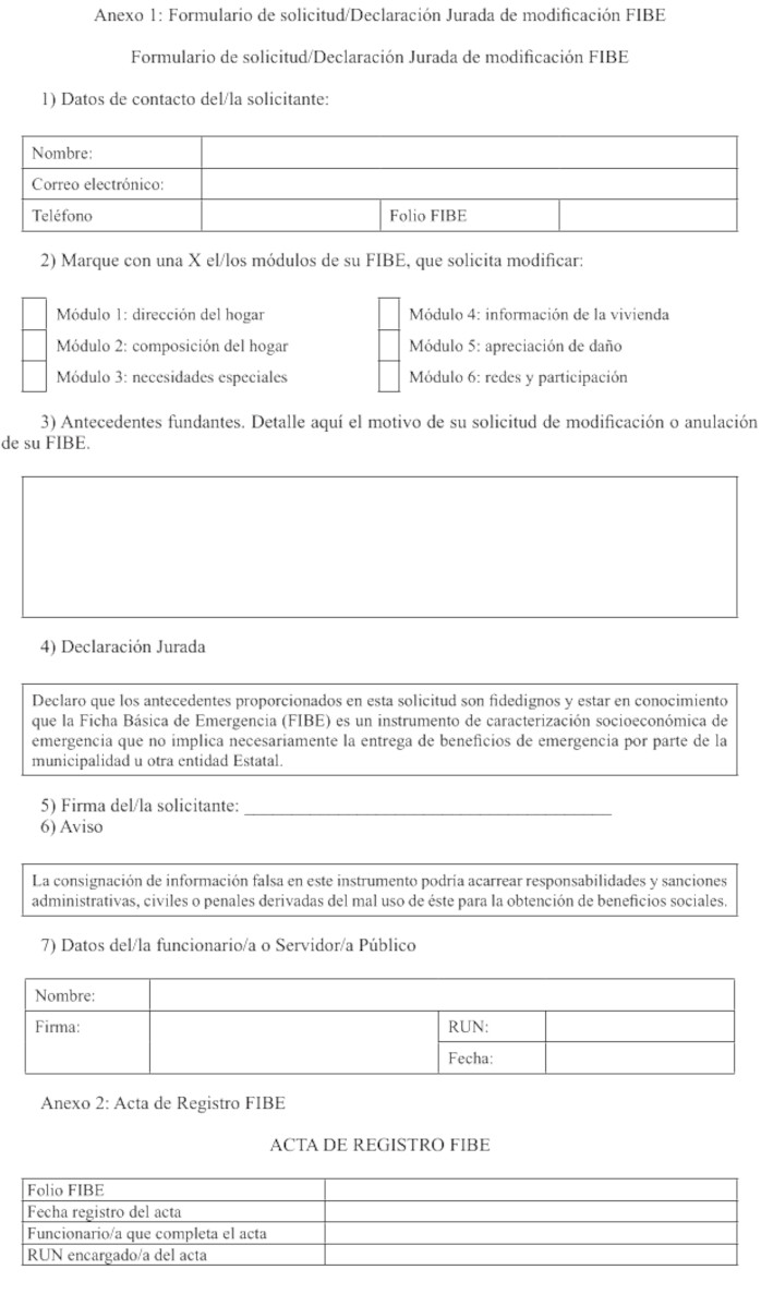Formulario de solicitud/Declaración Jurada de modificación FIBE: formulario a través del cual un integrante mayor de 18 años de una FIBE solicita la modificación de ésta indicando los antecedentes de ello y los campos que requieren ser modificados o anulados, con sus respectivos antecedentes. Contiene una declaración jurada a través de la cual el solicitante indica que la información que se consignará en el instrumento es fidedigna y señala estar en conocimiento de los efectos de la entrega de información falsa para la obtención de beneficios asociados a la emergencia.