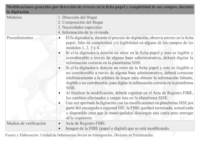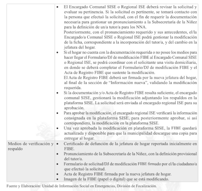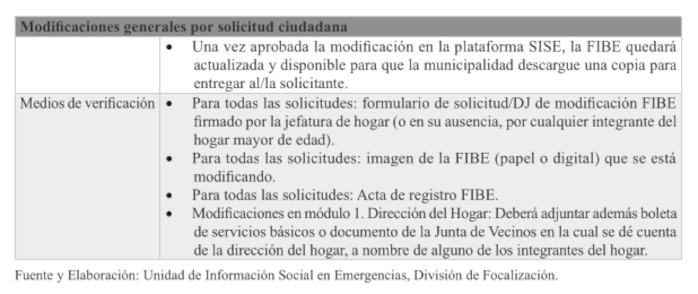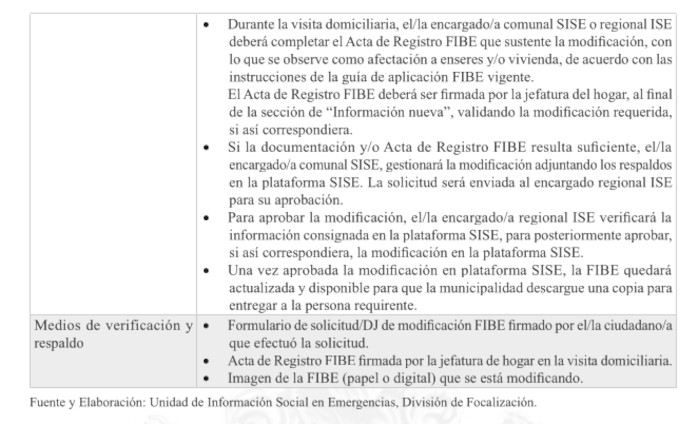 Este proceso debe acompañarse de la solicitud de supervisión por denuncia y/o del formulario de modificación/DJ, el informe de Supervisión, la imagen de la FIBE a modificar (papel o digital), el Acta de Registro FIBE firmada por uno de los integrantes mayores de 18 años que estén solicitando este cambio. Una vez efectuada la modificación, la FIBE quedará actualizada y disponible para que la municipalidad descargue desde SISE una copia para entregar al/la requirente.