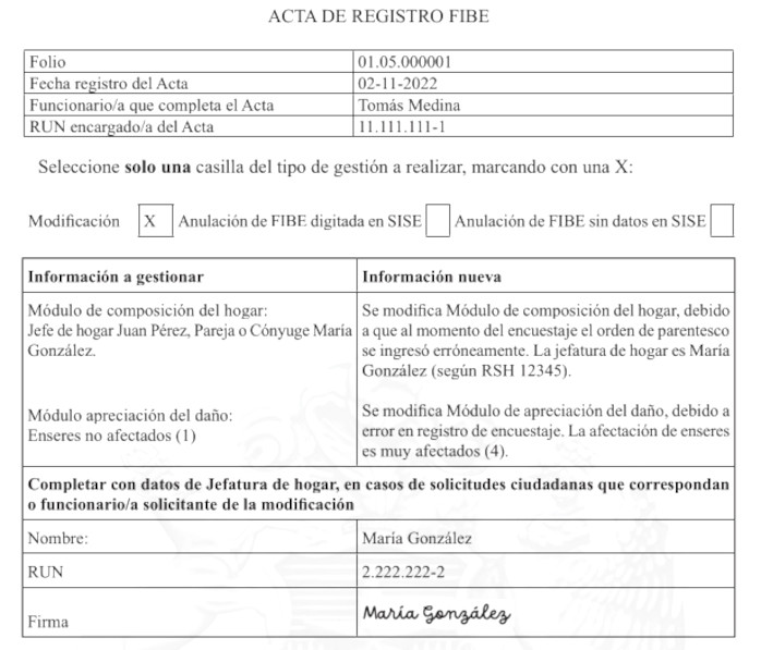 Acta de registro FIBE: documento que permite registrar los cambios o anulaciones en fichas, a través del cual se deja constancia de estos.