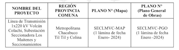 2. Línea de Transmisión 1x220 kV SE Volcán Colachi - SE Seccionadora Los Maitenes: línea eléctrica de circuito simple, entre la Subestación Volcán Colachi y la Subestación Seccionadora Los Maitenes.