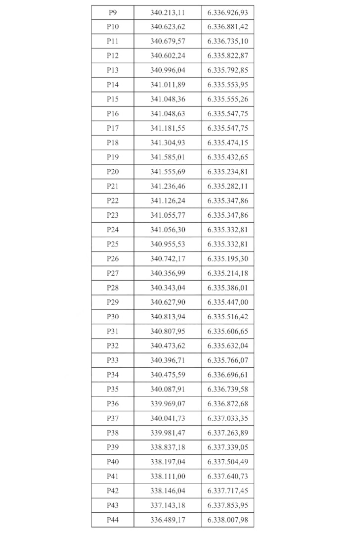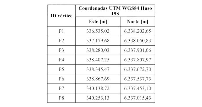 6º Que, los estudios técnicos para los cuales se solicita la concesión provisional se desarrollarán en la siguiente área, correspondiente a 1.558.255 m² aproximadamente, y que se encuentra delimitada por los siguientes vértices descritos por las coordenadas UTM (Datum WGS 84, Huso 19S), en la Región Metropolitana, provincia de Chacabuco, comunas de Til Til y Colina. Las localidades contempladas en el último censo afectadas por el área de estudio corresponden a Huechún, Quilapilún y Peldehue: