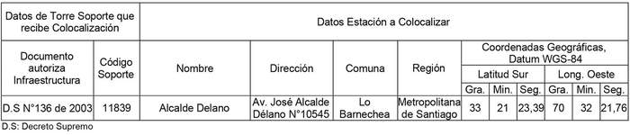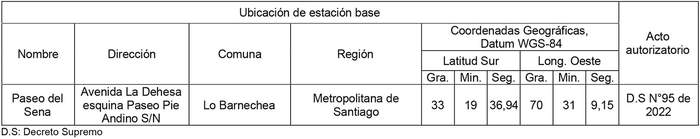 3. Para el ingreso Subtel N° 110.320 de 26.08.2024. Autorízase a la concesionaria para modificar la dirección de una (1) estación base autorizada en nueva infraestructura, mediante decreto supremo N° 95 de 2022, a instalarse en infraestructura autorizada del tipo colocalización, según se indica continuación: