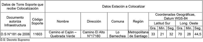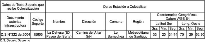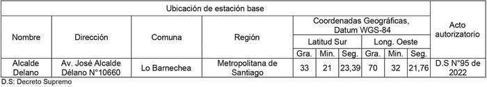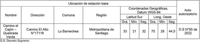 2. Para el ingreso Subtel N° 110.219 de 26.08.2024. Autorízase a la concesionaria para modificar la dirección de una (1) estación base autorizada en nueva infraestructura, mediante decreto supremo N° 95 de 2022, a instalarse en infraestructura autorizada del tipo colocalización, según se indica continuación: