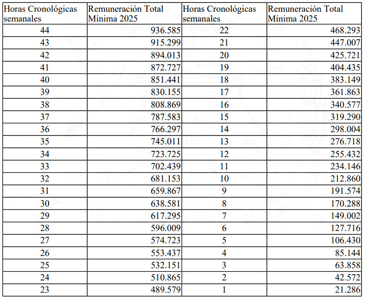 Artículo segundo: Establécese la siguiente tabla de cálculo de la Remuneración Total Mínima en pesos, correspondiente al año 2025, para aquellos profesionales de la educación que tengan una designación o contrato inferior a 44 horas cronológicas semanales: