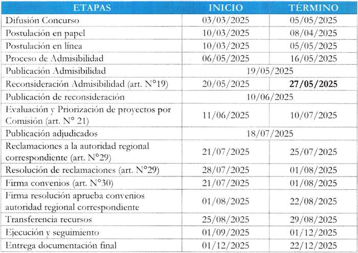 7. Que, en el punto "5. Calendario del Concurso" de las Bases del Fondo de Fomento de Medios de Comunicación Social Regionales, Provinciales y Comunales, año 2025, se señalan las fechas de reconsideración admisibilidad, indicando que existe plazo para realizar las gestiones correspondientes entre el día 20 de mayo y 26 de mayo de 2025.