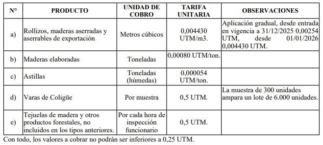 2.- Se deja expresa constancia que la tarifa fijada en el numeral anterior, letra a) correspondiente a Rollizos, maderas aserradas y aserrables de exportación por metro cúbico de 0,004430 UTM, se aplicará gradualmente de la siguiente forma: