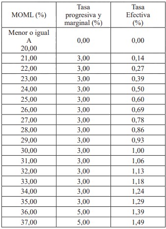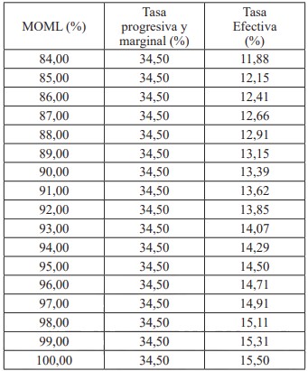 La tasa efectiva corresponderá a la aplicación de tasas progresivas y marginales a los distintos tramos definidos, en conformidad a lo dispuesto en la Tabla 3.