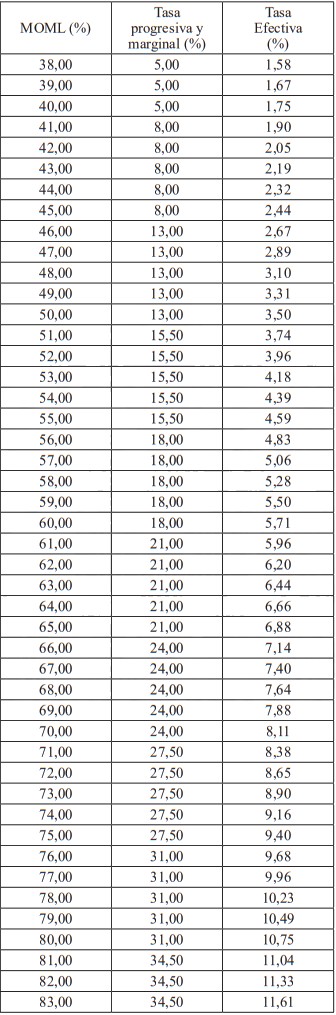 La tasa efectiva corresponderá a la aplicación de tasas progresivas y marginales a los distintos tramos definidos, en conformidad a lo dispuesto en la Tabla 2.