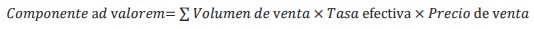 El componente ad valorem se entenderá como el monto que se obtiene de multiplicar el volumen de venta de los productos de litio por la tasa efectiva correspondiente por el precio de venta. El total del componente ad valorem será la suma de dicho componente calculado separadamente para cada producto de litio. El componente ad valorem se determinará según la siguiente fórmula: