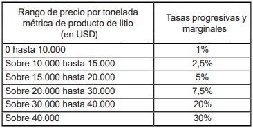 Tabla 3: Tasa de pago del componente Ad Valorem para productos de litio según precio
