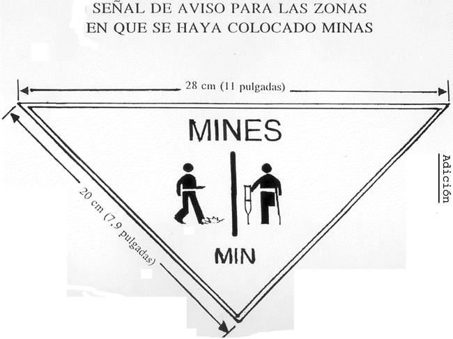 Se utilizarán señales análogas a las del ejemplo adjunto y según se especifican a continuación para marcar los campos de minas y zonas minadas a fin de que sean visibles y reconocibles para la población civil: