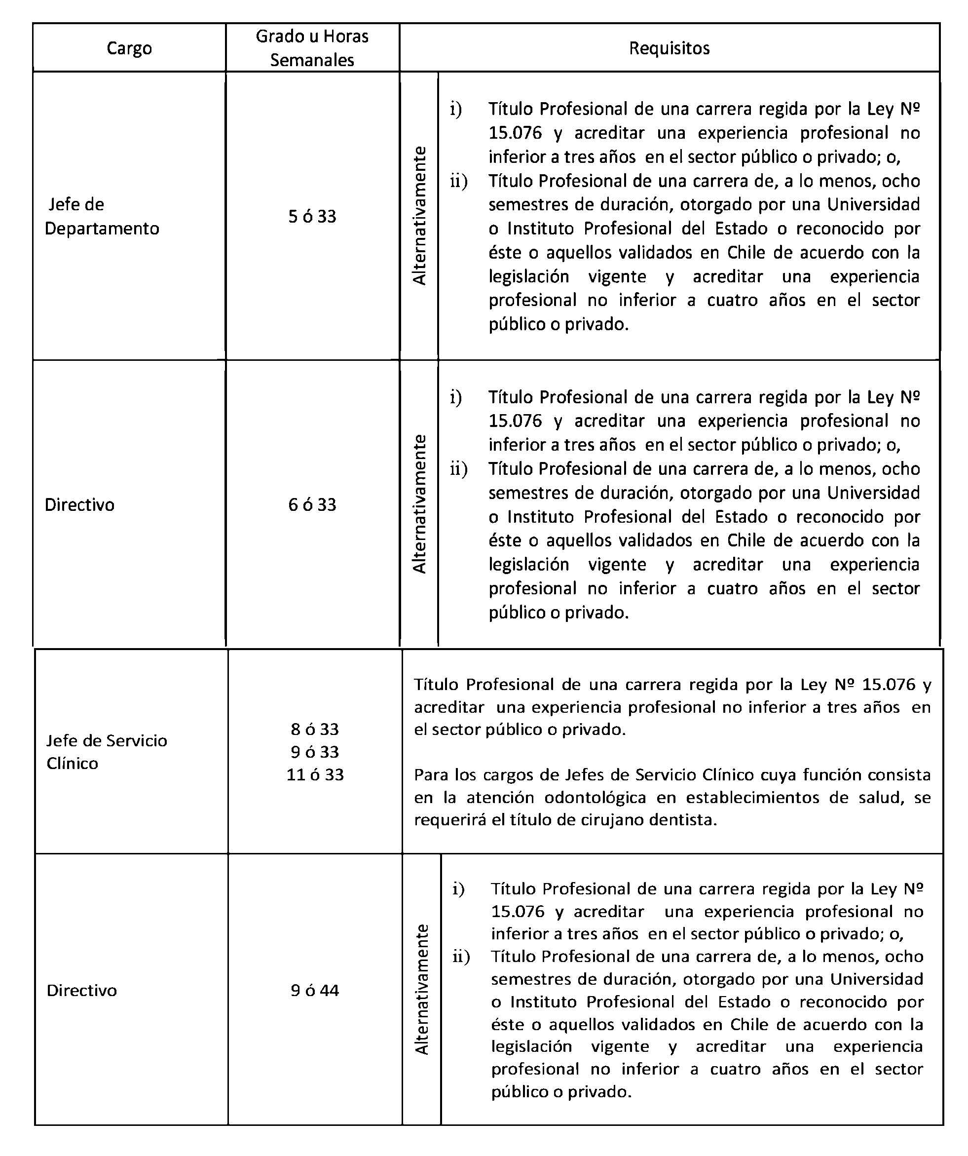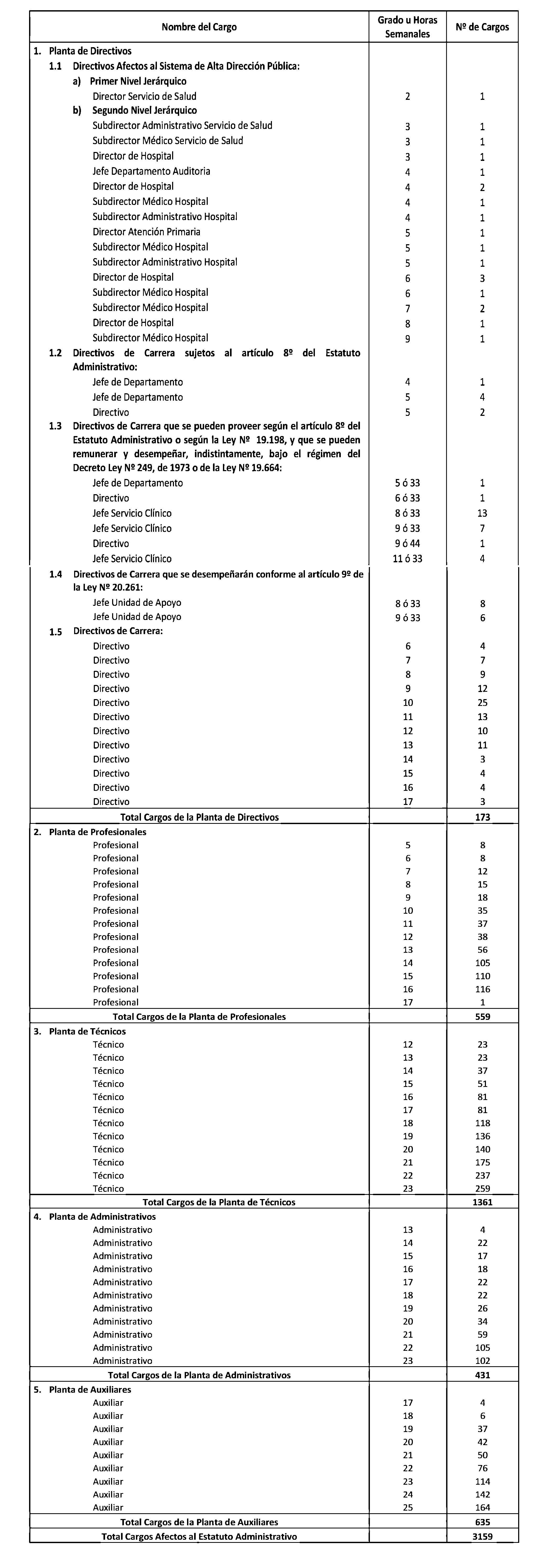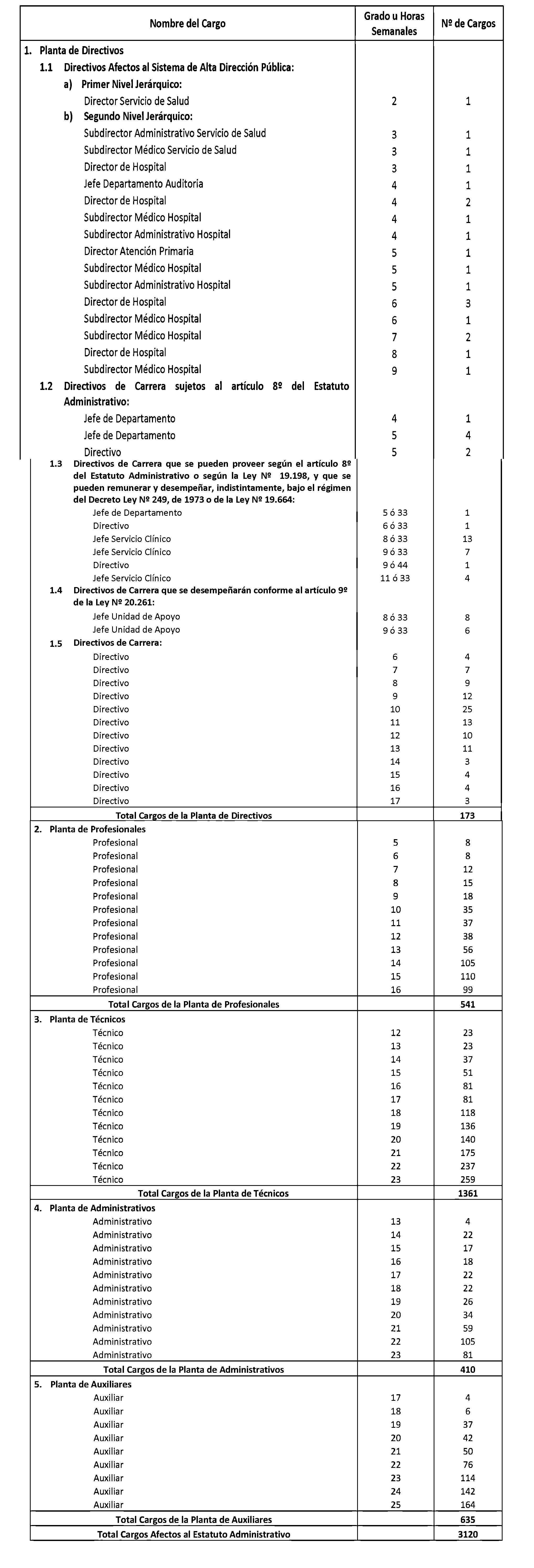 El Art. 1° del Decreto con fuerza de Ley 5, Salud, publicado el 17.01.2015, modifica los puntos 1.3 y 1.4. de la Planta de Personal establecida en el presente artículo en el sentido de suprimir, en la Planta de Directivos de Carrera, los cargos de "Directivo", "Jefe Servicio Clínico" y "Jefe Unidad de Apoyo" que la citada norma indica. Por su parte, su Art. 2° crea 539 horas en la Planta Profesional de Horas, que representan los cargos suprimidos en virtud del Art. 1°.