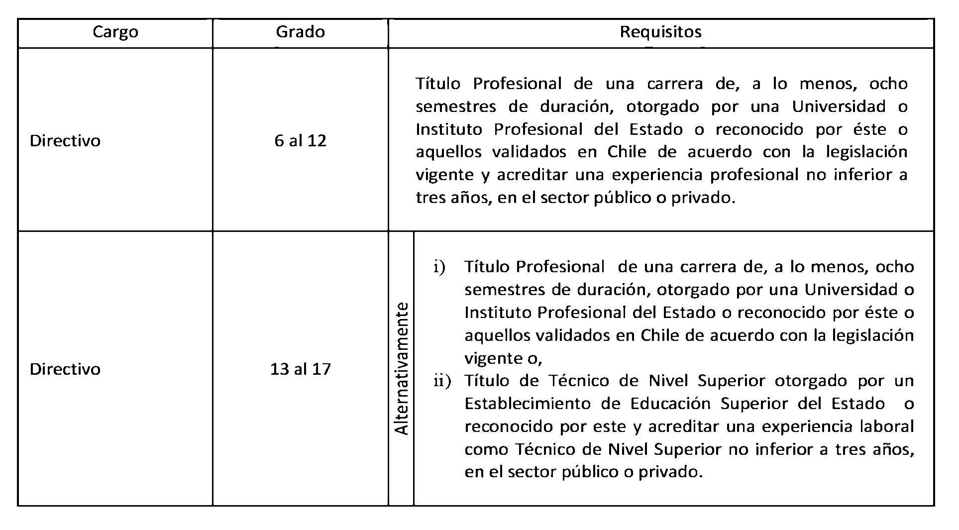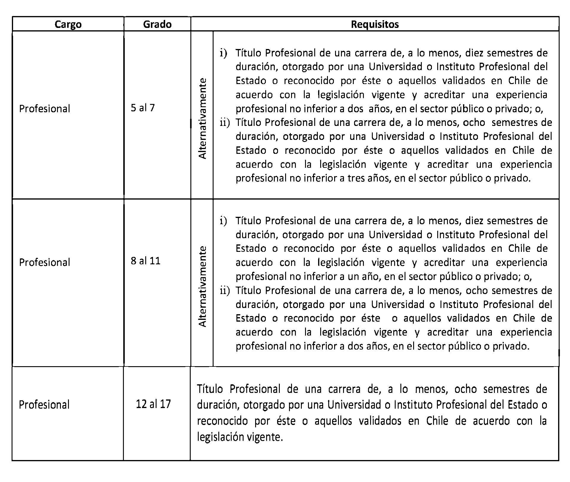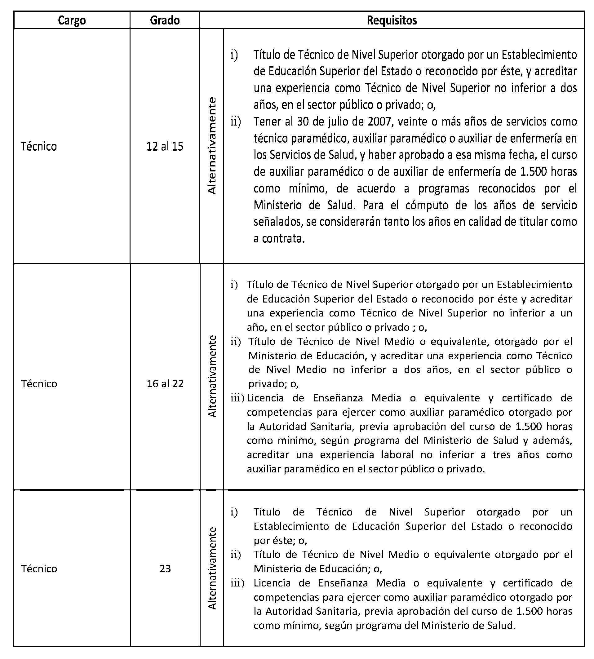 D.O. 12.12.2013Artículo 2°. Establécense los siguientes requisitos para el ingreso y promoción en las plantas y cargos que se indican a continuación: