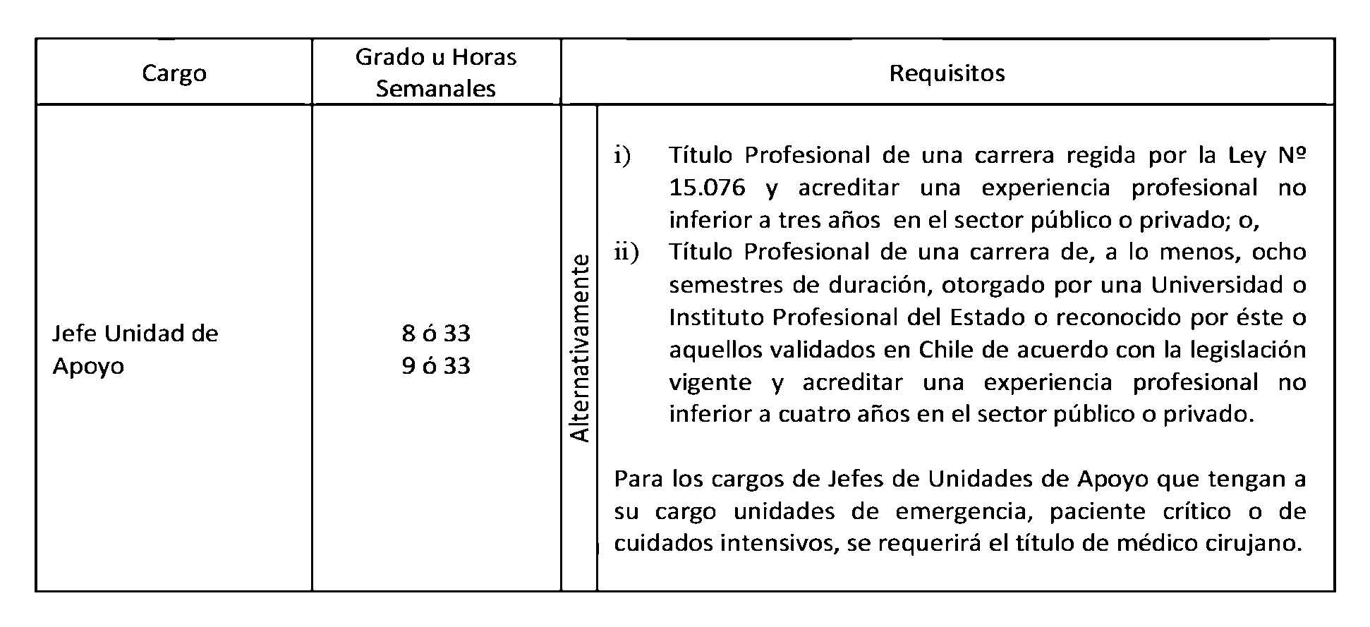Los cargos de Jefes de Unidades de Apoyo señalados en el punto 1.4 de este artículo, corresponden a los cargos de Jefes de Unidades de Apoyo Diagnóstico y de Jefes de Unidades de Apoyo Clínico Terapéutico a que se refiere el artículo 9° de la Ley N° 20.261.