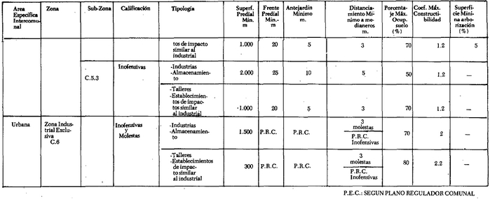 C.6. Zona Intercomunal Industrial Exclusiva del Area Urbana. La que establece el Plan Intercomunal de Santiago en el Area Urbana, según lo graficado en el plano RM PIS 89-25. Usos de suelo permitidos: Actividades productivas de carácter industrial, correspondientes a industrias, talleres, almacenamiento, establecimientos de impacto similar al industrial, calificados como inofensivos y molestos.