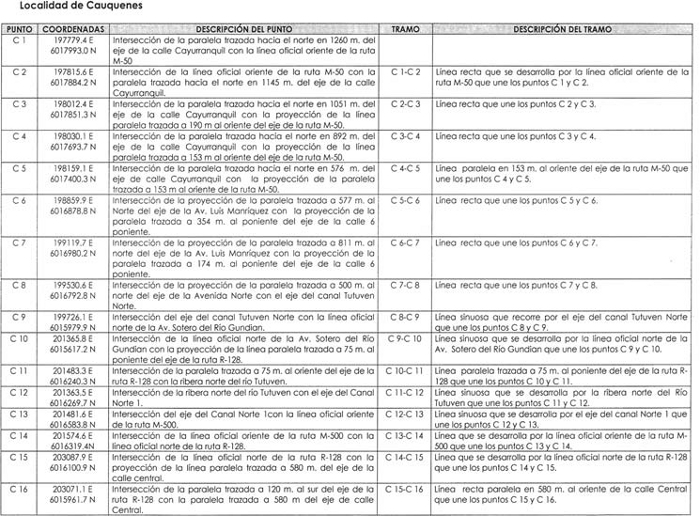 Los límites urbanos del Plan Regulador Comunal de Cauquenes (PRCC) graficados en los Planos mencionados en el Artículo 1 de la presente OL, se encuentran compuestos por las líneas poligonales cerradas definidas por los puntos C1, C2, C3, C4, C5, C6, C7, C8, C9, C10, C11, C12, C13, C14, C15, C16, C17, C18, C19, C20, C21, C22, C23, C24, C25, C26, C27, C28, C29, C30, C31, C32, C33, C34, C35, C36, C37, C38, C39, C40, C41, C42 y Cl para la Localidad de Cauquenes; BE1, BE2, BE3, BE4, BE5, BE6, BE7, BE8, BE9, BE10, BE11 y BE1 para la Localidad de Barrio Estación y SS1, SS2, SS3, SS4, SS5, SS6, SS7, SS8, SS9, SS10, SS11, SS12 y SS1 para la Localidad de Santa Sofía, los que se describen a continuación: