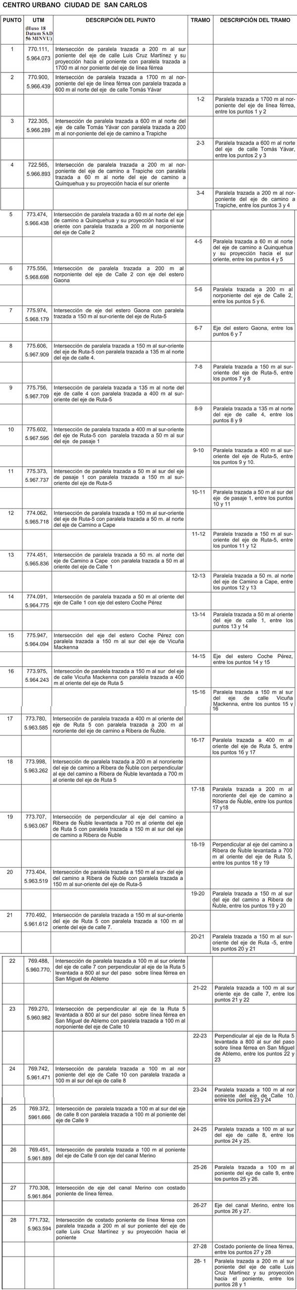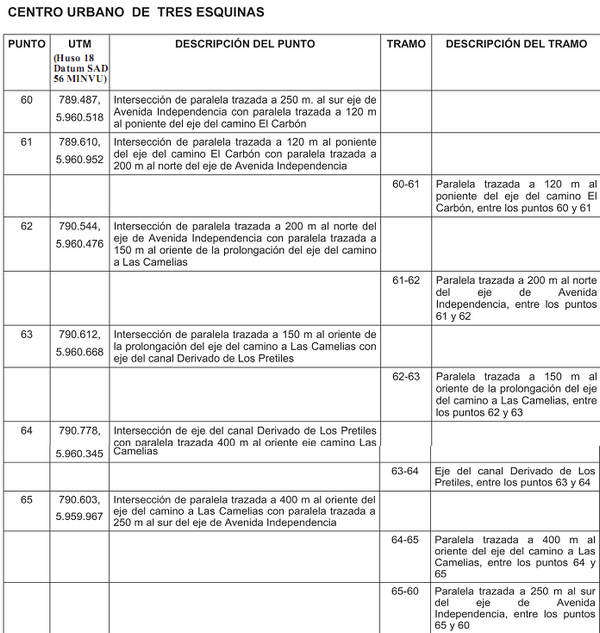 ARTÍCULO 6.- LÍMITE URBANO. El límite urbano del área reglamentada por el presente Plan Regulador Comunal, se define de conformidad con la descripción de puntos y tramos que se detalla a continuación: