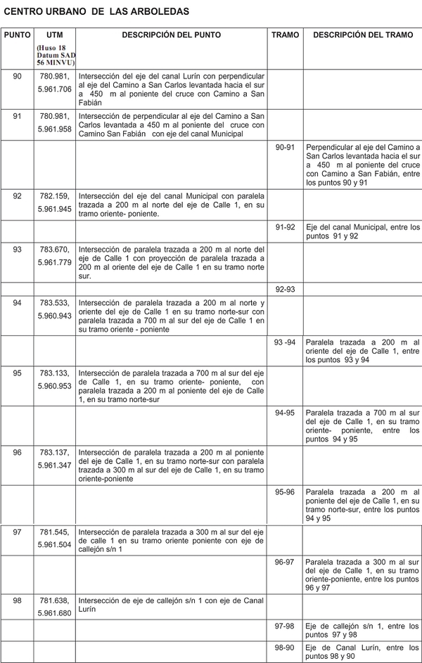 ARTÍCULO 3.- TERRITORIO DEL PLAN. El área urbana reglamentada por el presente Plan Regulador Comunal esta definida por el límite urbano que corresponde a las líneas poligonales cerradas graficadas en los planos que se indican a continuación, que se complementan con esta Ordenanza, y cuya descripción de puntos y tramos se describen en el Artículo 6: