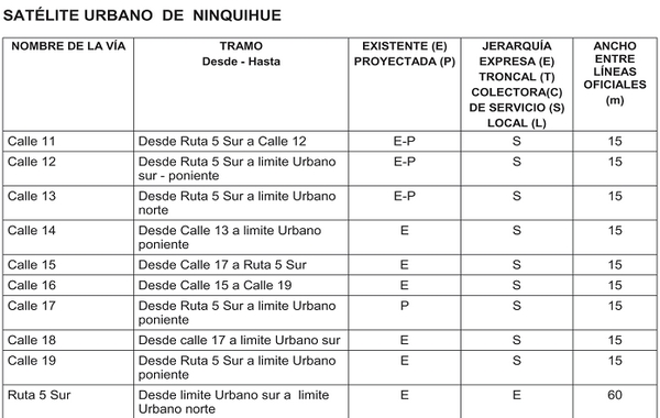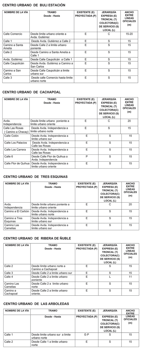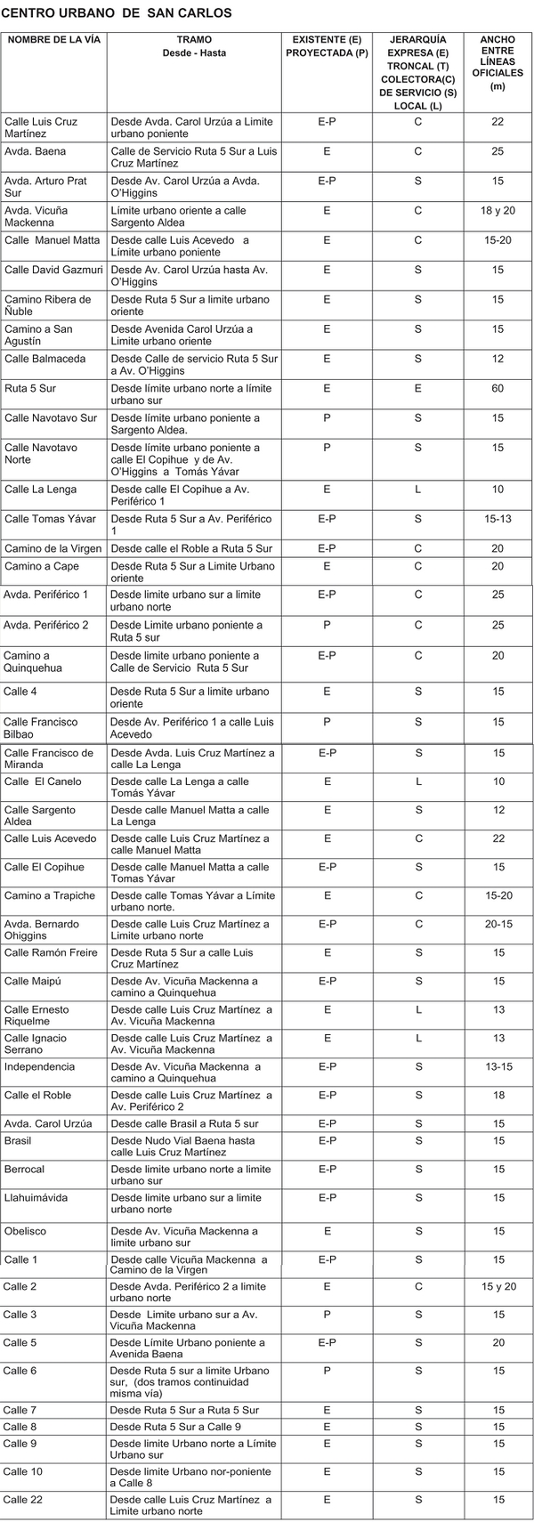 ARTÍCULO 7.- VIALIDAD EXISTENTE. Las avenidas, calles y pasajes y en general todas las vías públicas del presente Plan Regulador Comunal, son las existentes, las que mantienen sus anchos entre líneas oficiales, salvo aquellos casos en que expresamente se determinen ensanches, prolongaciones o apertura de nuevas vías.