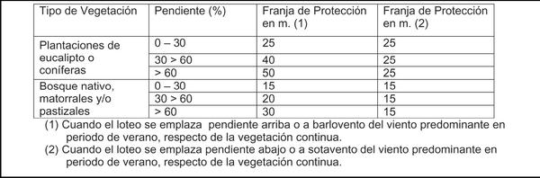 Los proyectos de loteo colindantes con áreas de vegetación continua deberán reservar una franja de ancho variable de acuerdo a la siguiente tabla, en la cual no se permitirán edificaciones: