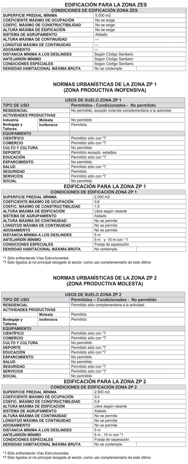 Las normas urbanísticas y condiciones específicas de cada zona son las siguientes: