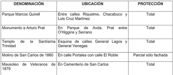 ARTICULO 38.- PROTECCIÓN PARA INMUEBLES DE CONSERVACIÓN HISTÓRICA. Los Inmuebles de Conservación Histórica que se identifican en el área urbana regulada por el presente Plan Regulador Comunal y su protección en función del grado de intervención, son los siguientes: