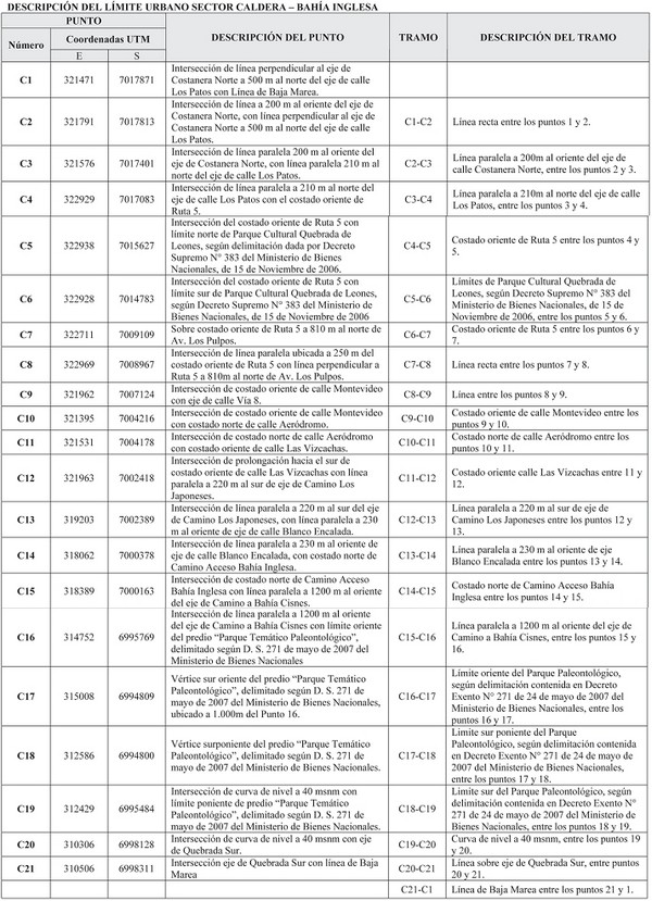 El Límite Urbano del Plan Regulador Comunal de Caldera comprende las siguientes localidades o sectores que se encuentran definidos en cada caso, por una línea poligonal cerrada, de acuerdo a los siguientes puntos: