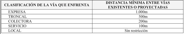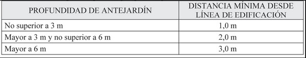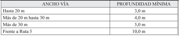 Cuando la norma de la zona correspondiente lo indique como determinado según el ancho de la vía que enfrenta, los anchos mínimos de antejardín se regirán por la siguiente tabla: