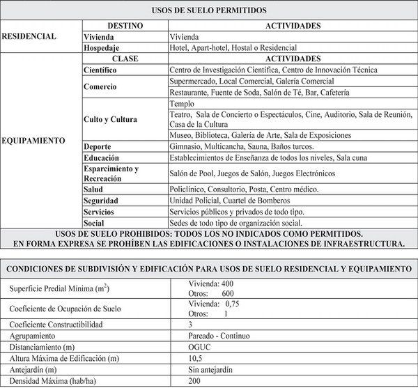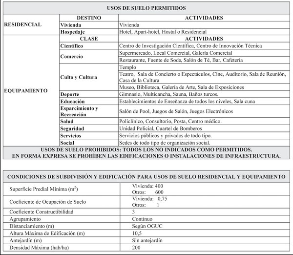 En la tabla siguiente se establecen las normas urbanísticas correspondientes a usos de suelo y condiciones de subdivisión y edificación.