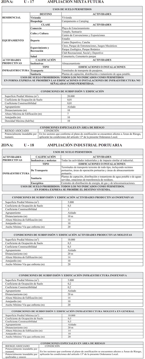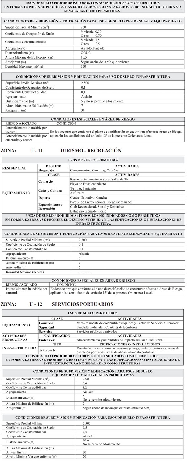 Los usos de suelo permitidos y prohibidos en el área normada por el PRCCAL son los indicados para cada Zona en el Artículo 21º de la presente Ordenanza Local. Se entienden prohibidos todos los usos no indicados como permitidos.
