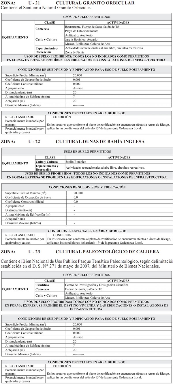 En el Bien Nacional de Uso Público Parque Temático Paleontológico delimitado según D. S. 271 de mayo de 2007 del Ministerio de Bienes Nacionales, se aplican las normas establecidas para la Zona C-3.