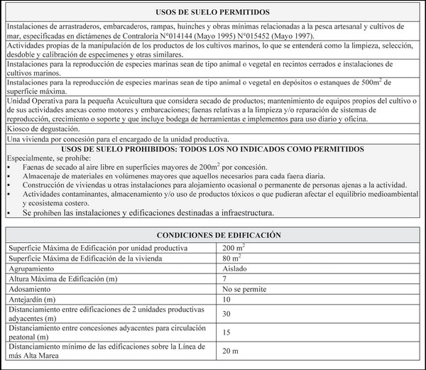 Se permiten instalaciones y construcciones complementarias a la navegación y a la vigilancia de actividades de pesca y acuicultura. Complementariamente, se podrán formar circuitos de circulación peatonal, estacionamientos y miradores.