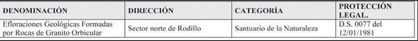 Corresponde al Santuario de la Naturaleza "Efloraciones geológicas formadas por rocas de granito orbicular" y se rige por las disposiciones de la Ley de Monumentos Nacionales, por lo que cualquier intervención deberá contar con la aprobación del organismo competente.