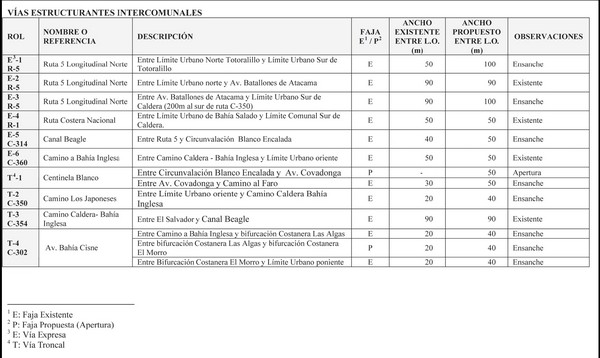 Corresponden a las vías intercomunales consignadas en el Plan Regulador Intercomunal de las Comunas Costeras de Atacama (PRICOST), descritas en el presente Artículo con sus respectivos roles (MOP), nombres, indicación de tramos, ancho entre líneas oficiales y si se trata de vía existente (E) o proyectada (P).