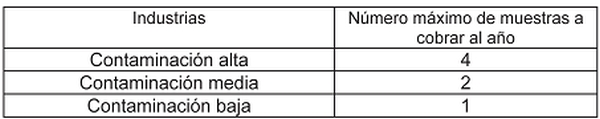 Los valores y número máximo de muestras a cobrar al año se han determinado de acuerdo a la clasificación de las industrias según el nivel de contaminación del efluente evacuado, cuya definición se indica a continuación: