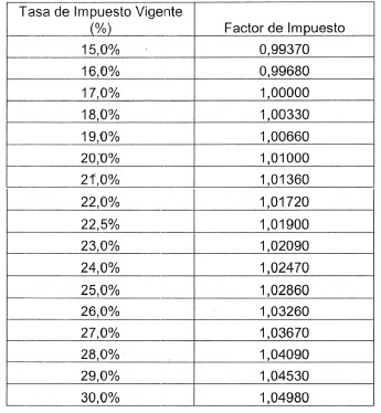 Los valores resultantes de la aplicación de los cargos anteriormente mencionados en este decreto, se incrementarán en función de la tasa de tributación vigente que grava las utilidades de las sociedades anónimas abiertas, considerando los factores para las tasas de tributación que se indican a continuación (tasas intermedias se interpolarán linealmente).Decreto 255, ECONOMÍA