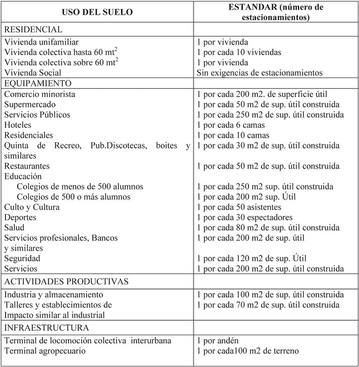 ARTÍCULO 16. Estacionamientos. Los edificios que se construyan, habiliten, cambien de destino o se regularicen, deberán cumplir, con las normas y estándares mínimos de estacionamiento que se señalan en el presente Artículo y lo señalado en el Art. 2.4.2. de la Ordenanza General de Urbanismo y Construcciones en lo relativo a materialización de estacionamientos en un predio distinto al que genera la obligación.
