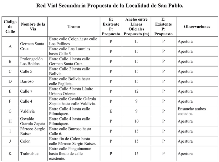 ARTICULO 30. Las avenidas, calles, pasajes y en general, todas las vías públicas del Plan Regulador Comunal de San Pablo, son las actualmente existentes en la localidad, manteniéndose sus anchos entre líneas oficiales, salvo aquellos casos en que expresamente se dispone en ensanche o apertura de nuevas vías.