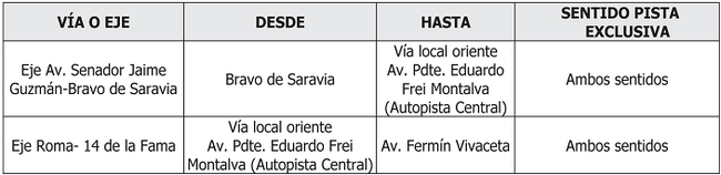 1.- Modifícase el cuadro inserto en el numeral 1.- del Resuelvo de la Resolución Exenta Nº 462, de 23 de febrero de 2007, de la Secretaría Regional Ministerial de Transportes y Telecomunicaciones de la Región Metropolitana, en el sentido de agregar, como nuevas filas al final del mismo, las siguientes vías, con sus correspondientes tramos y sentidos de exclusividad de las pistas.
