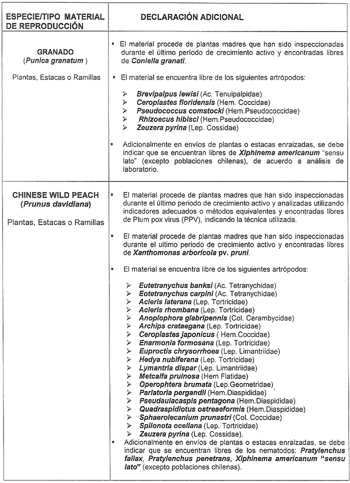 1.2 Además, se debe indicar en el Certificado Fitosanitario las siguientes declaraciones adicionales específicas para cada especie y tipo de material de reproducción que a continuación se señalan: